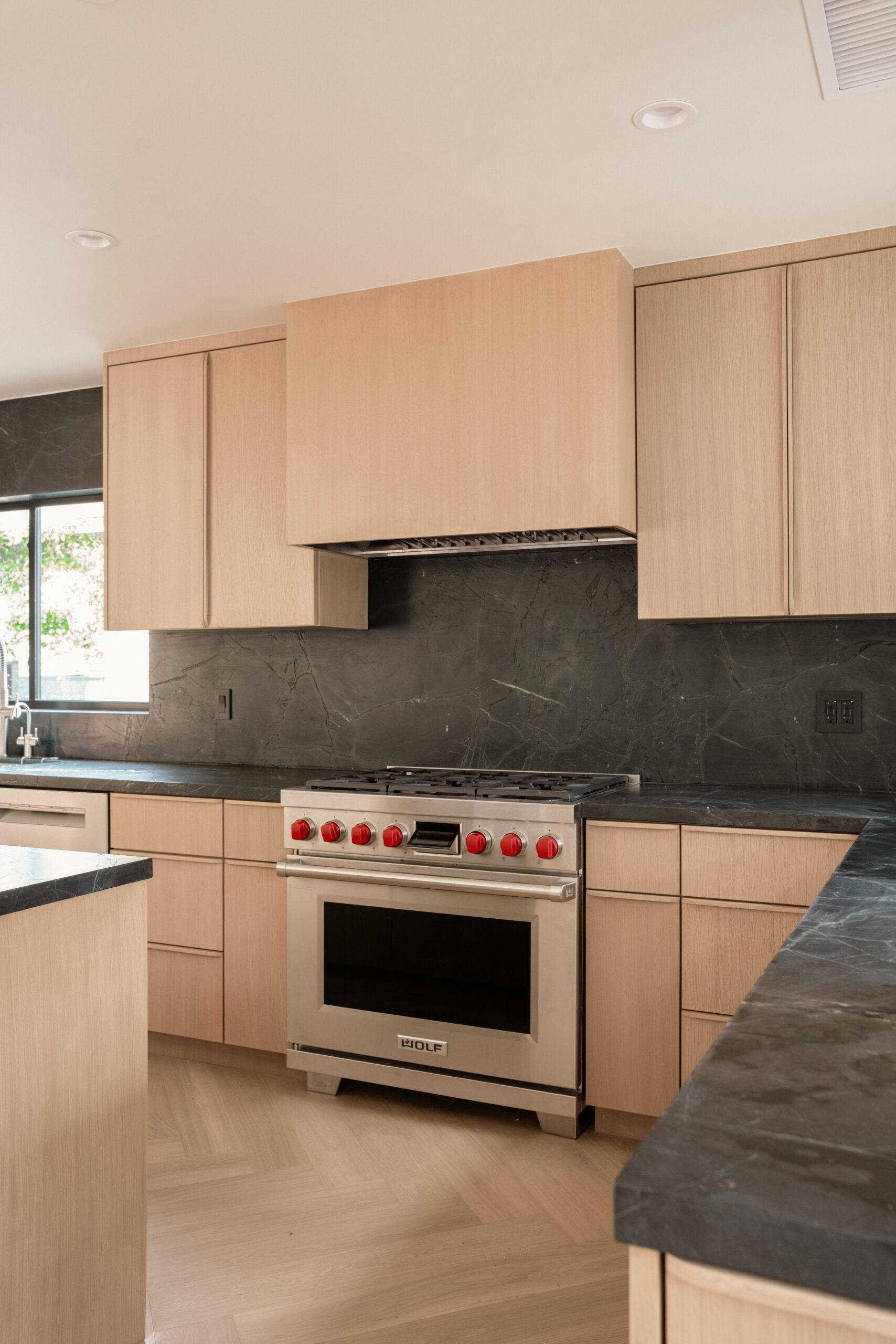 Interior finishes include custom oak cabinetry with clean, modern detailing and herringbone wood flooring throughout the main living areas, adding warmth, texture, and timeless character.