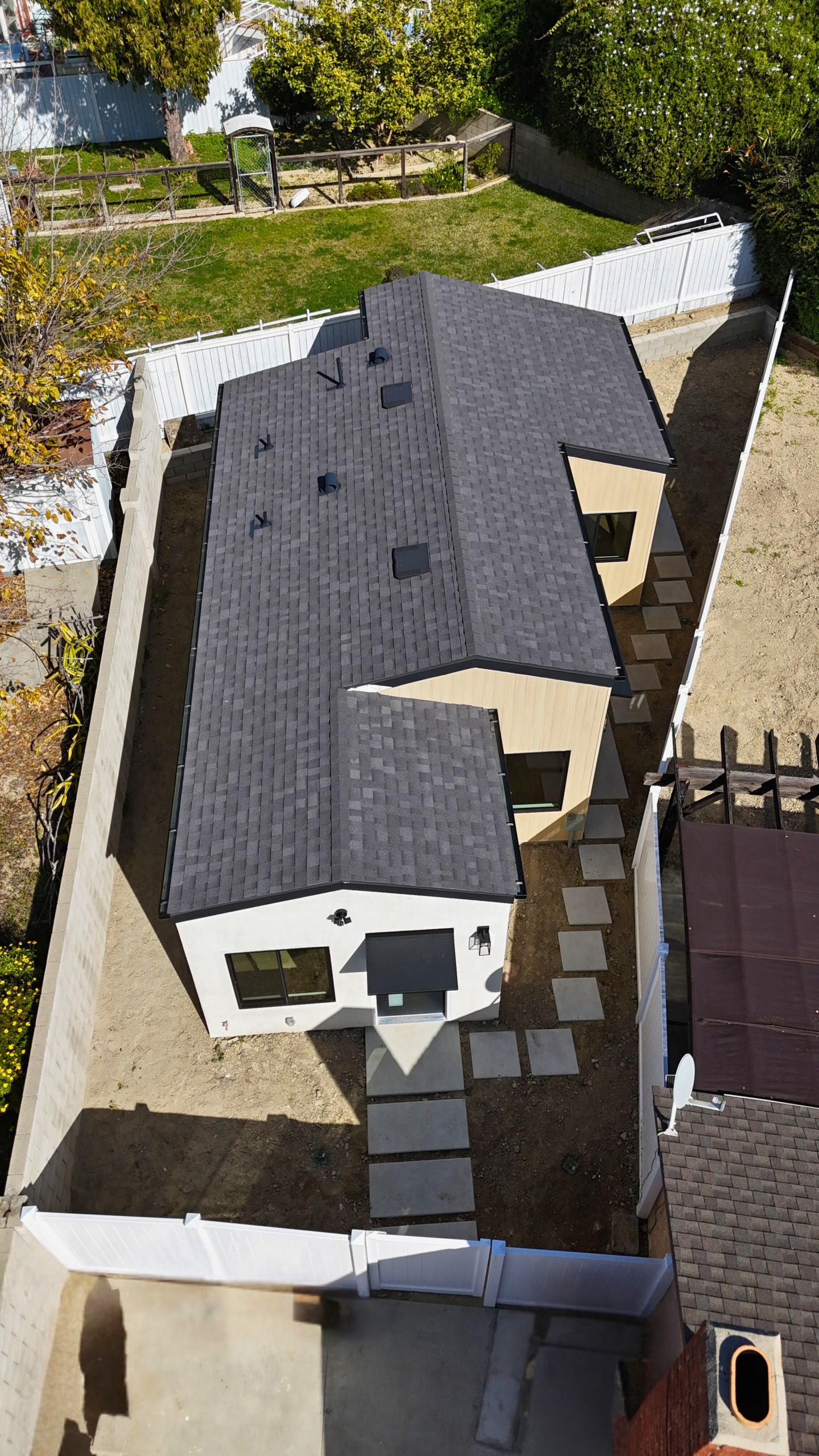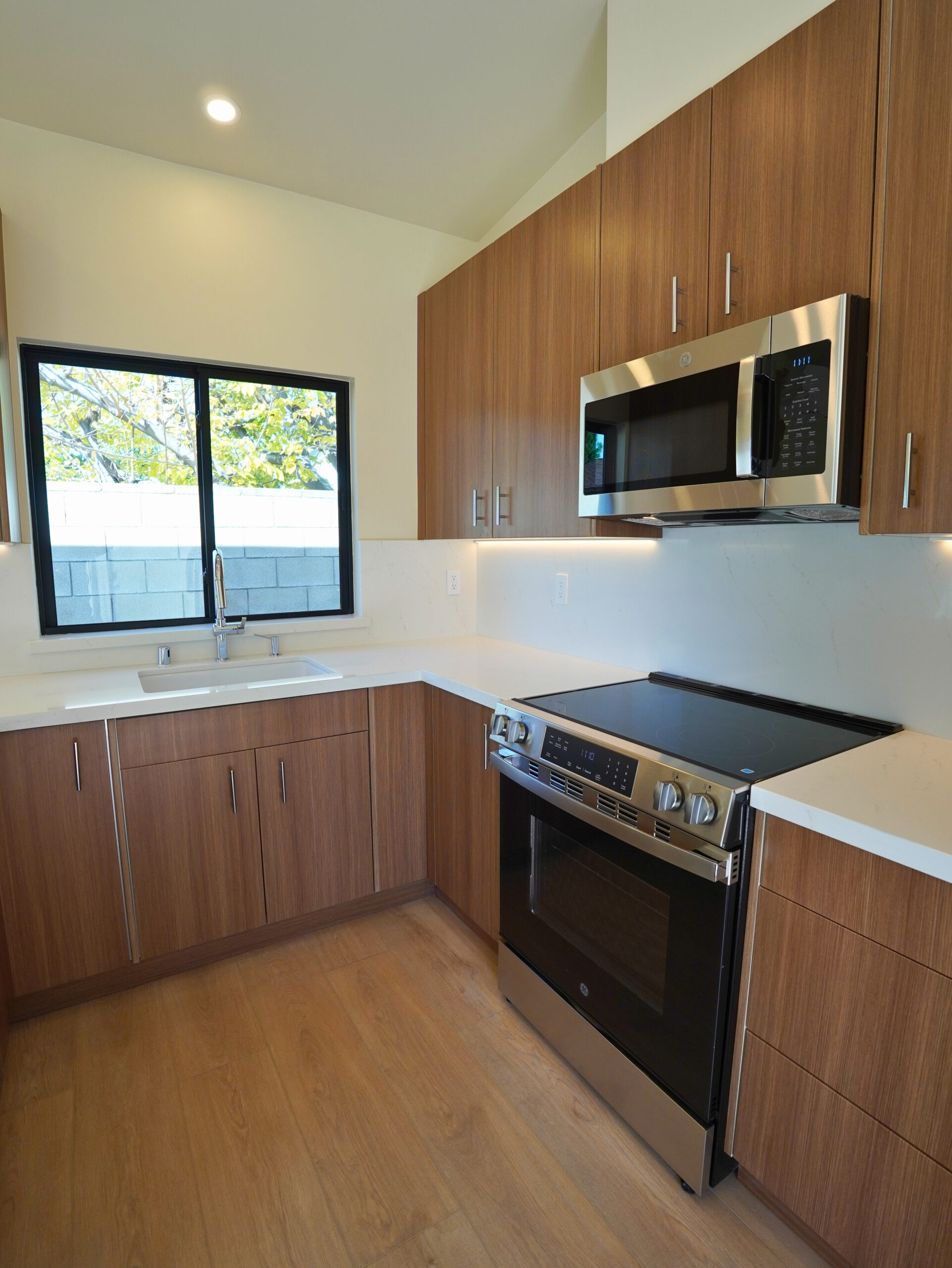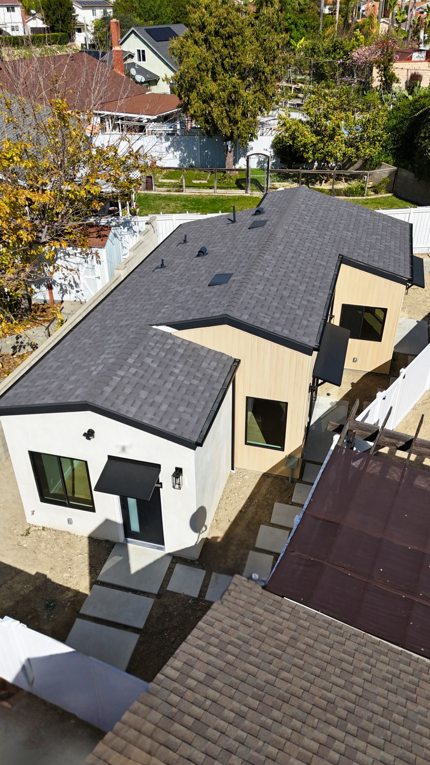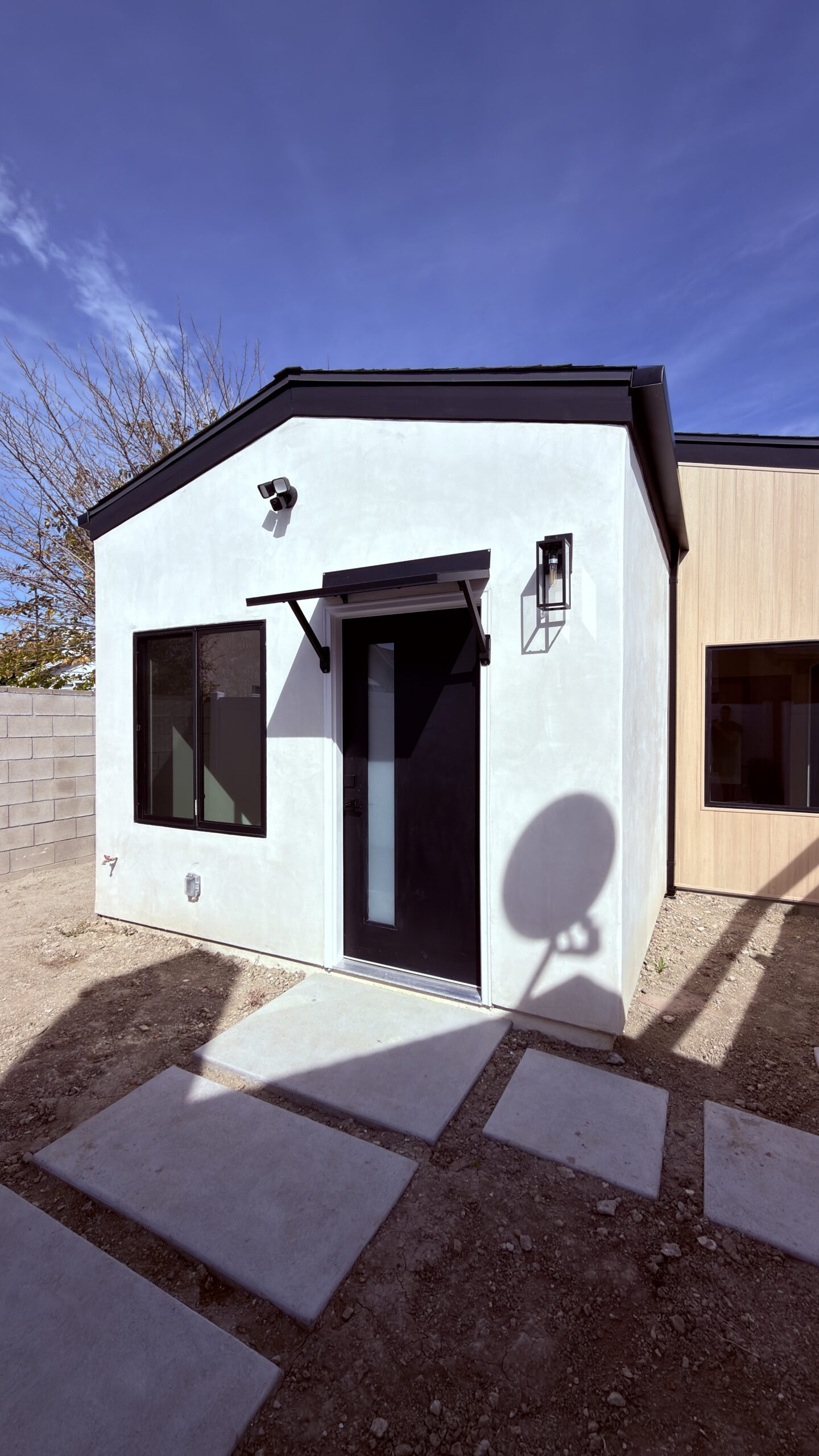 The project included full site preparation, new concrete foundation, structural framing, and complete mechanical, electrical, and plumbing systems from rough through finish. All work was performed in compliance with local building codes and Title 24 energy requirements. The exterior combines smooth stucco with composite wood siding accents, energy-efficient dual-pane windows, and a new roofing system with proper drainage integration. Inside, the open-concept kitchen and living area maximize space and natural light.