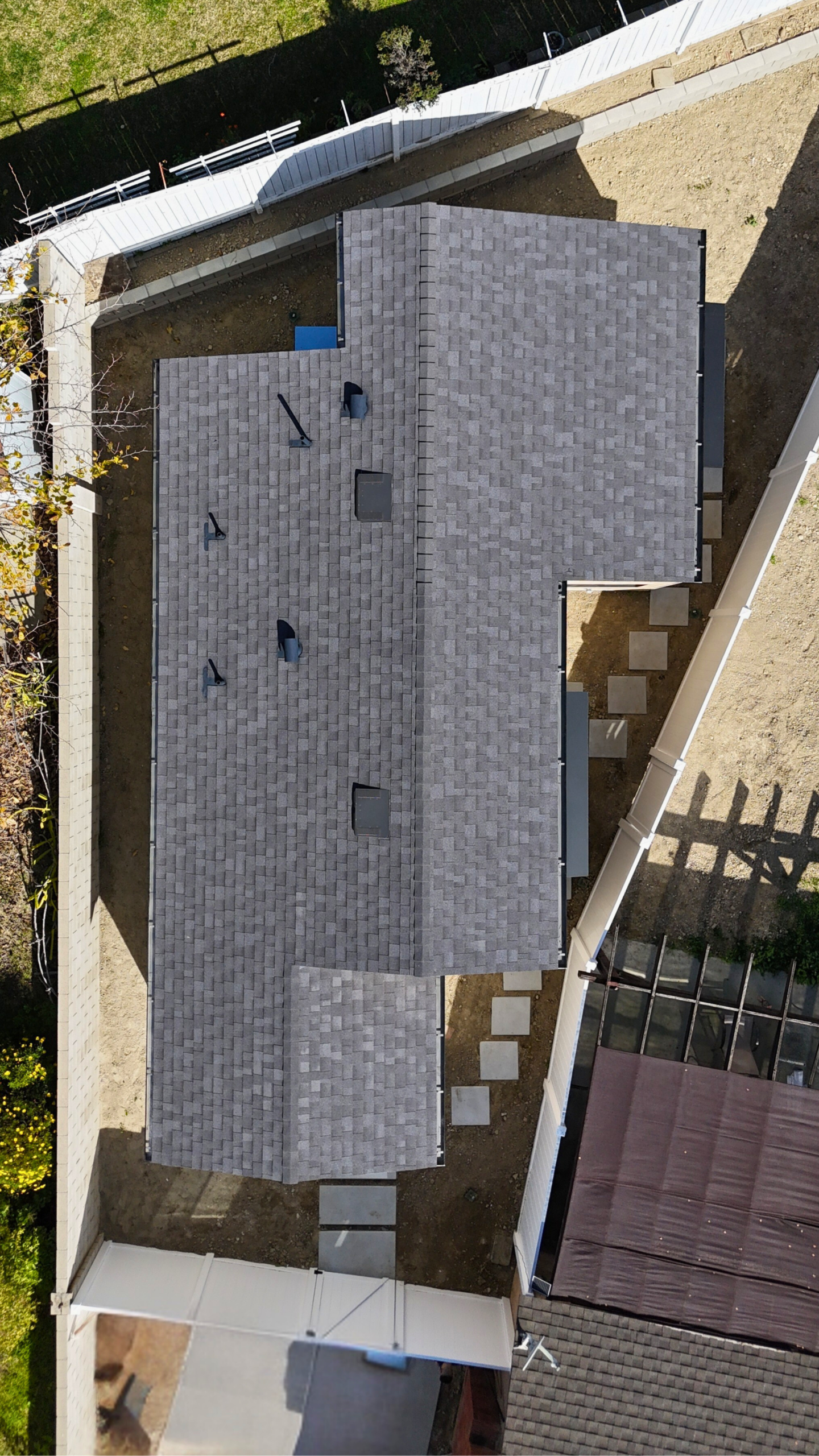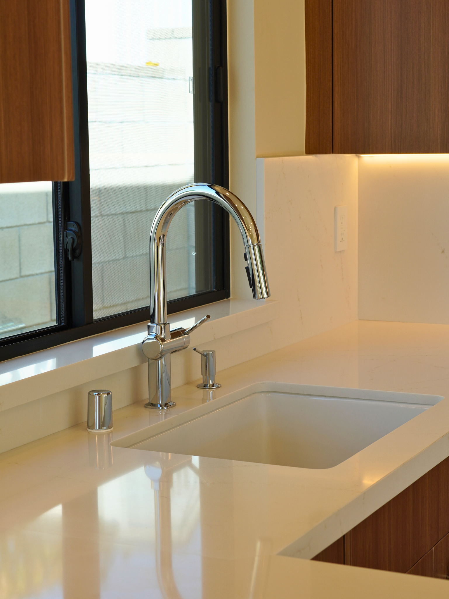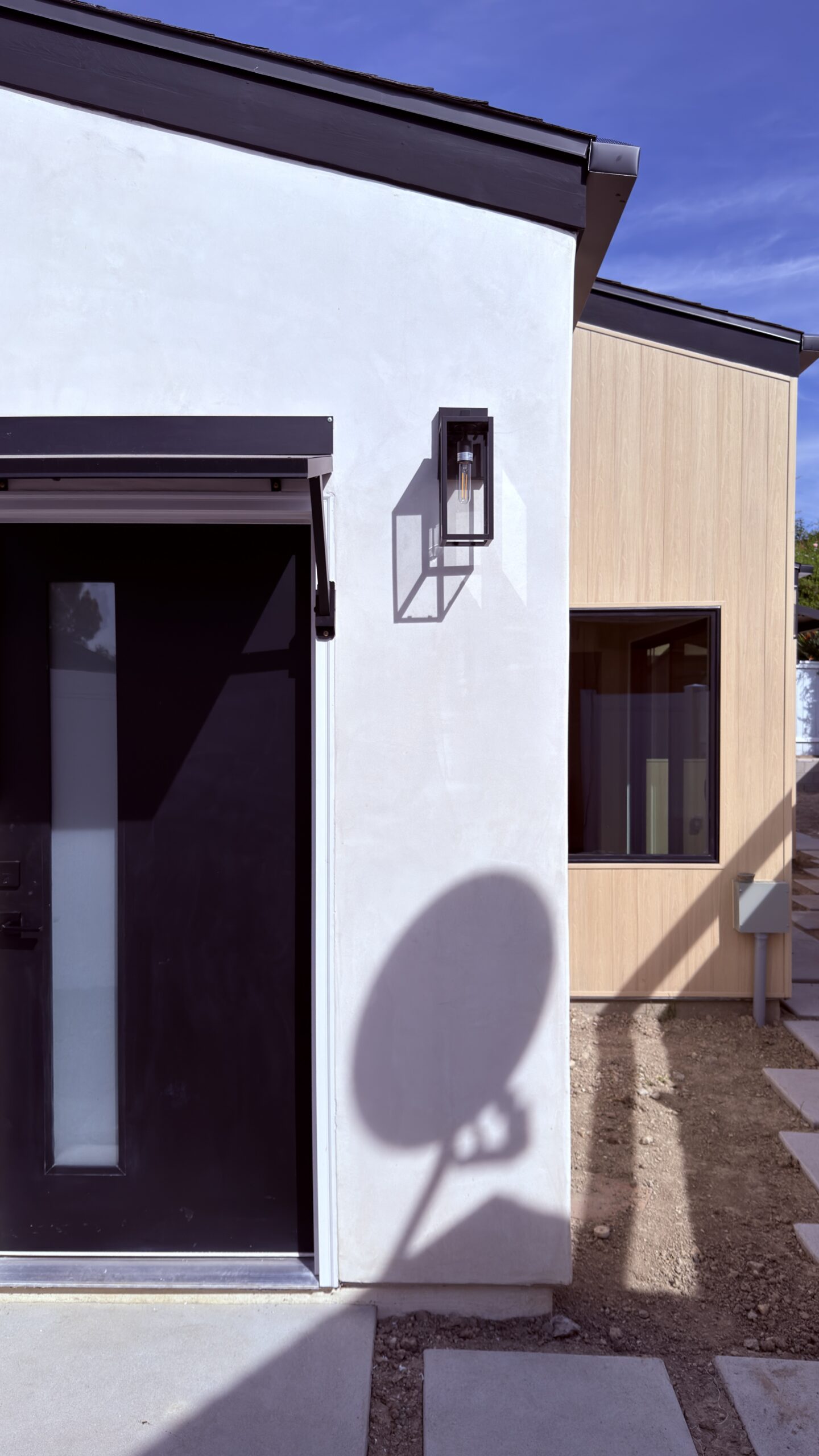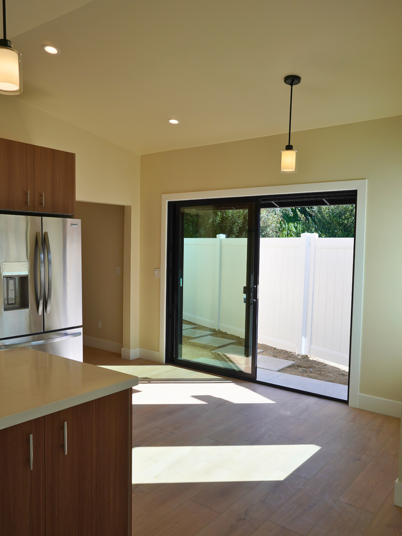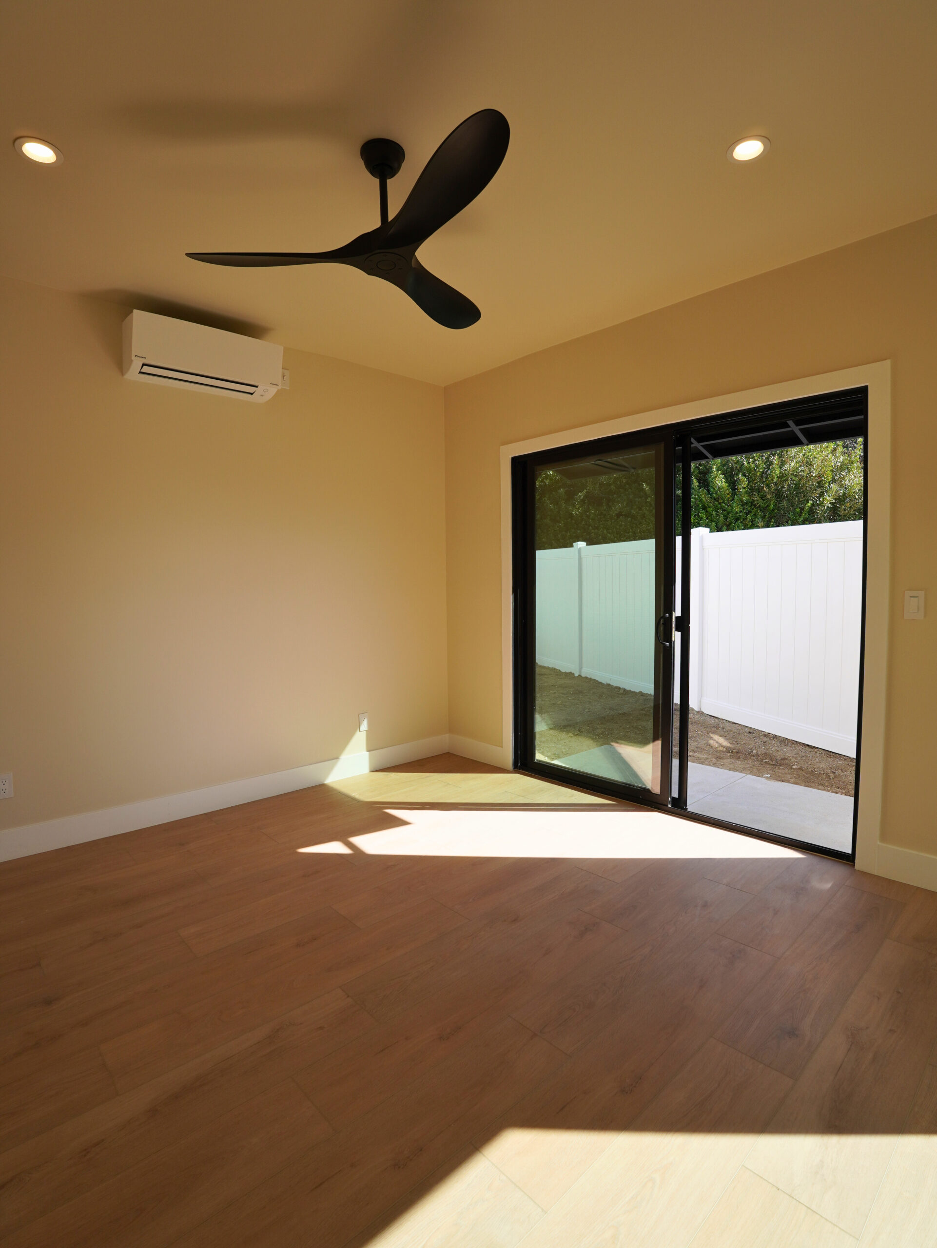 The project included full site preparation, new concrete foundation, structural framing, and complete mechanical, electrical, and plumbing systems from rough through finish. All work was performed in compliance with local building codes and Title 24 energy requirements. The exterior combines smooth stucco with composite wood siding accents, energy-efficient dual-pane windows, and a new roofing system with proper drainage integration. Inside, the open-concept kitchen and living area maximize space and natural light.
