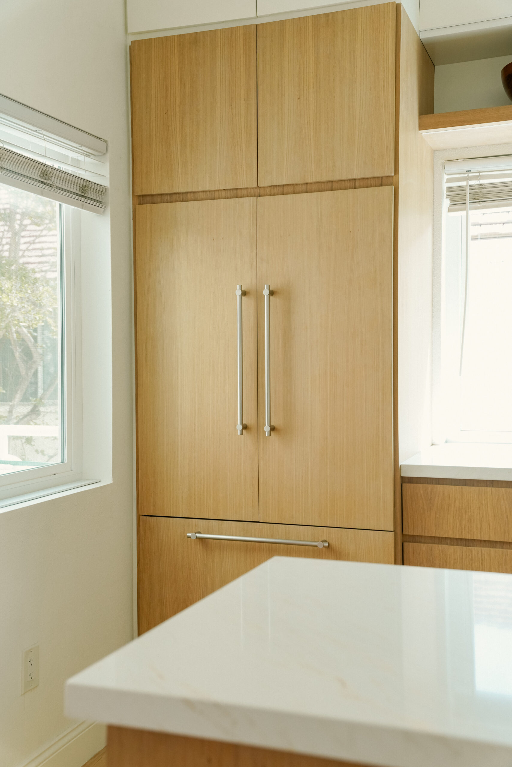 In the kitchen remodel, we maximized storage and visual flow with custom two-tone cabinetry sleek painted upper cabinets paired with warm oak veneer lower cabinets. Custom finger pulls on the drawers and panel-ready appliances keep the design clean and seamless, creating an uncluttered look that feels spacious and sophisticated. Durable porcelain countertops are paired with large-format backsplash tiles, enhancing the feeling of openness and delivering an elegant, modern finish.